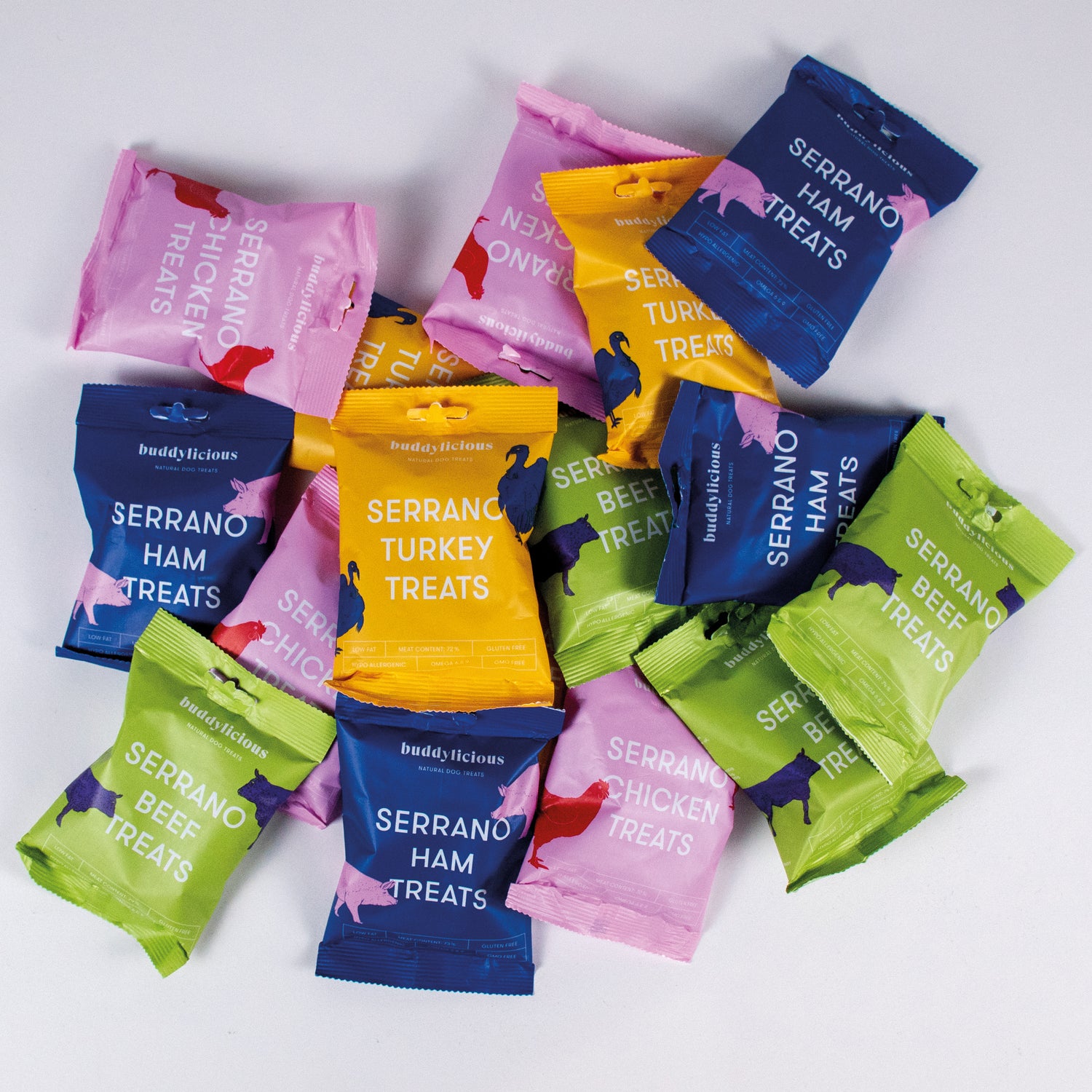 Our Serrano Turkey Treat is a mouth-watering dog treat made from the finest turkey and Serrano ham. This semi-moist treat is a natural, GMO-free, gluten-free, and hypoallergenic. With a meat content of 72%, this low-fat treat is also rich in omega 6 & 9, making it a healthy and nutritious snack for your furry friend.